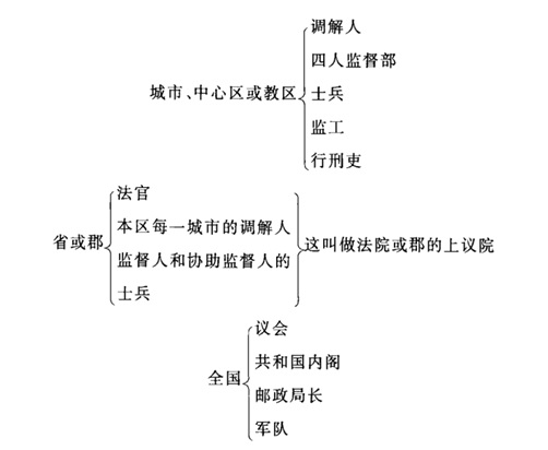 在教区或城市可以选举三四个或六个调解人,有时甚至可以选举更多的调解人,这要看地区的大小而定。他们的职责有二:第一,常驻在委员会里,主持教区的事务,防止发生骚乱,维护公共和平。在这方面,他们可以称为顾问。