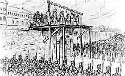 After this speech, they conversed yet a bit with the different ministers of their religions and all showed great piety. At around 9:45 they placed themselves above the fatal trap and the executioner made his final preparations, after which the provost marshal, a sergeant of the army — who more or less filled the role of sheriff — gave the signal that was to put an end to their sufferings and their lives. Death was more or less instantaneous with Hindenlang and Nicolas; de Lorimier and Daunais seemed to suffer a short time. But the sufferings of Narbonne were long and horrible. Since one of his arms had been cut it hadn’t been possible to tie him up as well as the others; in his final convulsions he untied his hand, with which he seized objects around him and managed to move the cord from its true position. He even managed twice to reach a balustrade nearby and to put his feet on it, and was pushed away.