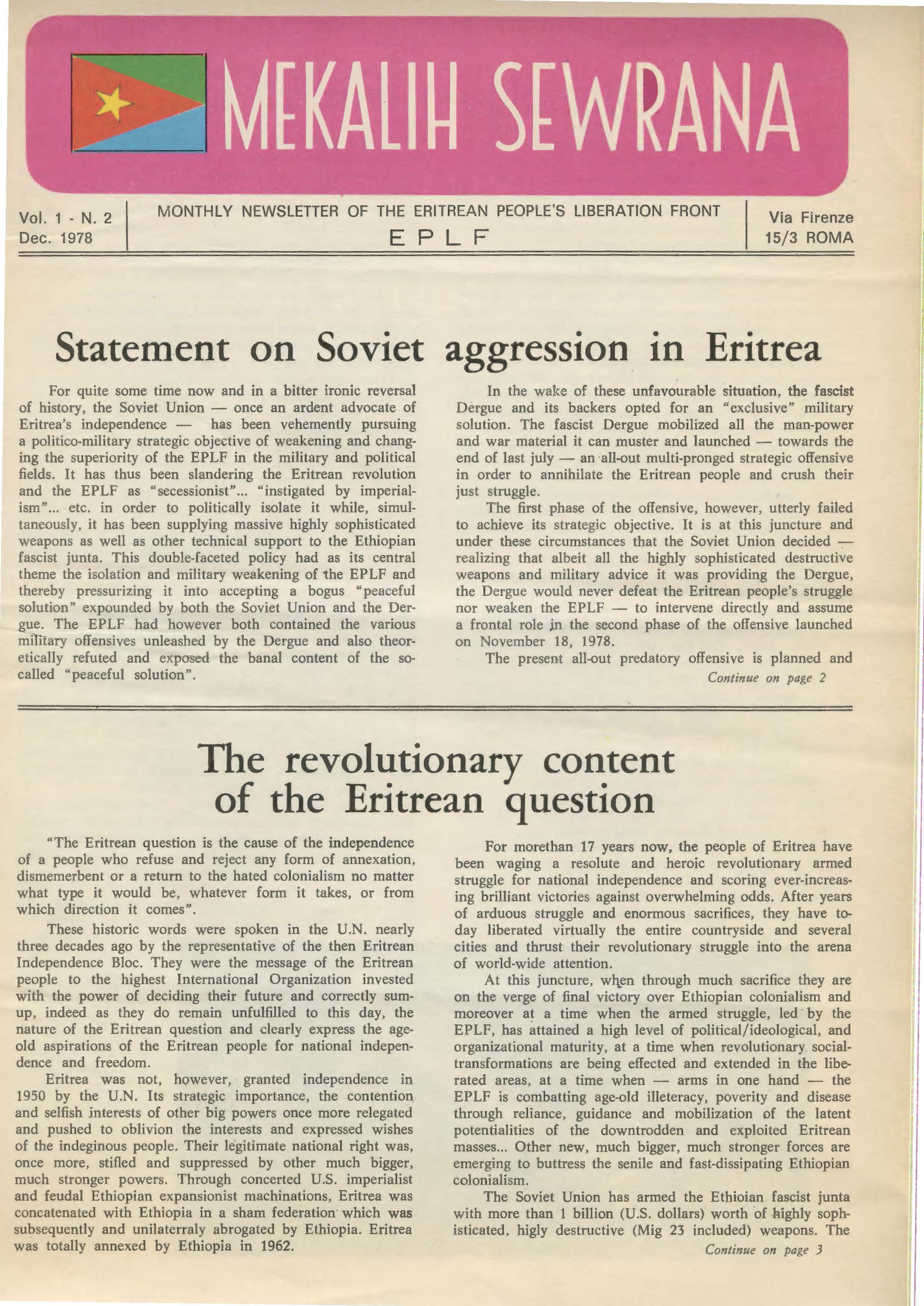 Eritrea - 500 Years of Struggle Speech by And Berhane [Southern Africa Support Committee Newsletter, Jan.-Feb.-March 1979]
