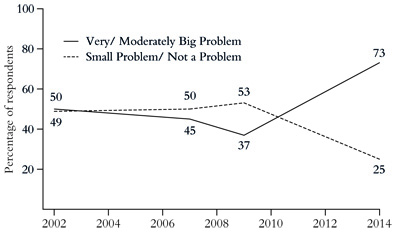 Under pro-Western president Viktor Yushchenko the government promoted an ultra-nationalistic reworking of history. The Nazi collaborators of Stepan Bandera were rehabilitated and Bandera himself was posthumously awarded the title “Hero of Ukraine” in 2010. Meanwhile the mainstream media gave increasing coverage to the Nazis of Svoboda. [16] This did not help Yushchenko, however. By the end of his presidency he was totally discredited, scoring 5 percent in the 2010 presidential elections. Up until 2009 ordinary Ukrainians’ concern about ethnic conflict was declining. But, as figure 2 shows, there was a sudden upturn in the wake of the crash and the stoking of tensions by the elite. [17]
