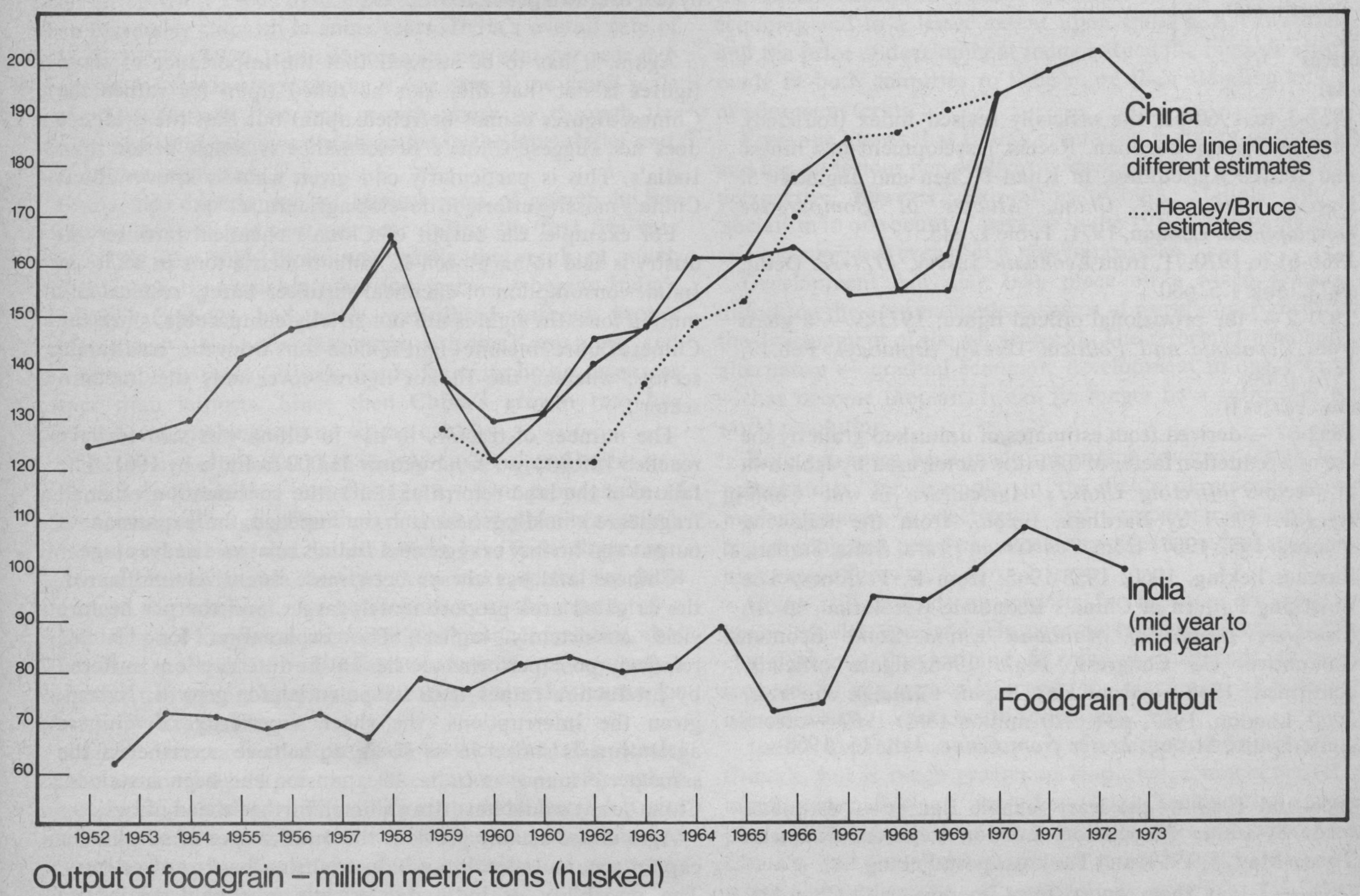 Food grains production dominates agriculture in both countries. So the annual grain harvest is the most significant single index of the performance of the economy. The graph shows the respective output of China and India. The Indian figures are official. The Chinese contain, for particular periods, different estimates.