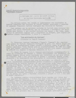 Nos últimos meses, foi levada ao conhecimento dos militantes do Partido Comunista uma circular do Comité Central anunciando a expulsão do camarada Francisco Martins Rodrigues das fileiras do Partido.
